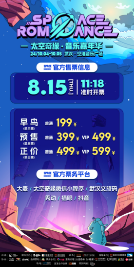 據(jù)了解,第二屆“太空奇緣音樂嘉年華”將于8月15日11:18分正式開票,其中,早鳥票僅售199元,預(yù)售票價則為399元,VIP預(yù)售票價為499元。