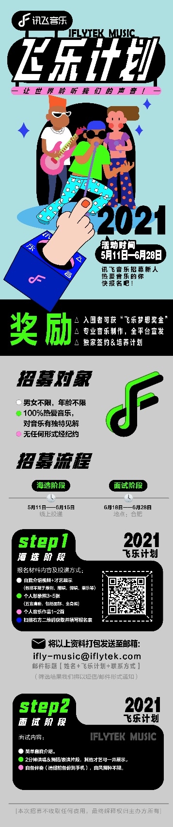 讓世界聆聽我們的聲音!訊飛音樂首屆新人招募活動飛樂計劃即日啟航,面向全國范圍,征集愛音樂、會創(chuàng)作的新聲音。飛樂計劃希望吸納更多 ...